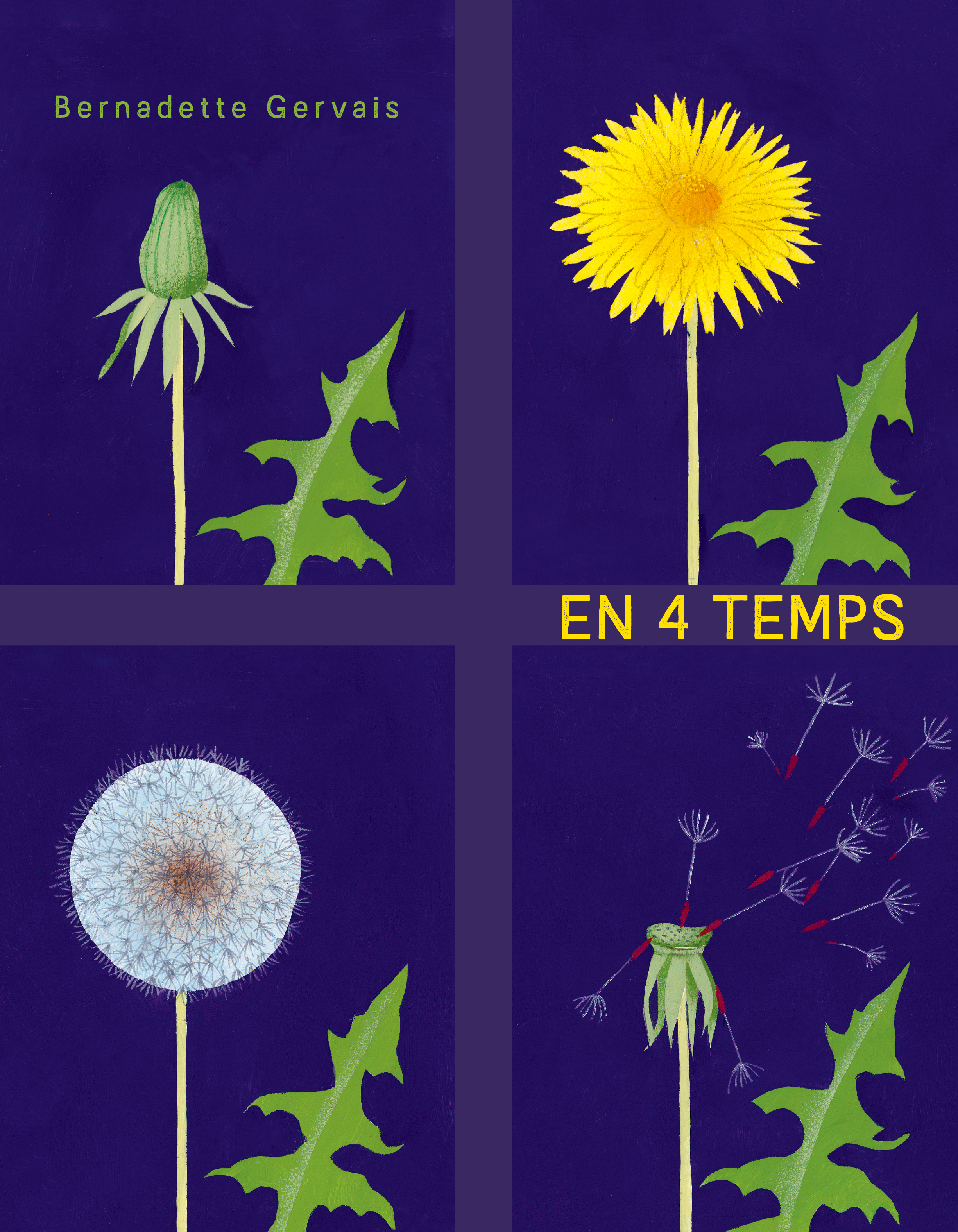 Chaque double-page capture un moment découpé en quatre séquences : un oiseau, ailes déployées, se pose dans son nid, une poire, d’abord verte, qui se décompose, un nuage passe au-dessus de nos têtes avant de disparaître.